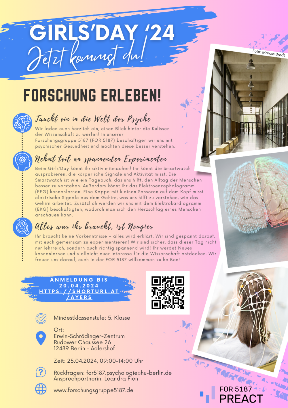 Am 25.04.2024 findet der Girls'Day unter Beteiligung unserer Forschungsgruppe statt. Die FOR 5187 lädt zehn Mädchen ins Institut für Psychologie der HU Berlin nach Adlershof ein, um ihnen eine Einführung in die Laufbahn einer Wissenschaftlerin zu geben und einen Einblick in unsere Forschungsgruppe zu gewähren. Nähere Informationen können dem Angebot auf der Seite des Girls'Days entnommen werden. Im Anhang befindet sich zudem ein Informationsflyer.