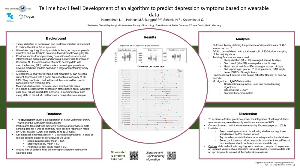 Auf der Konferenz der Society for Ambulatory Assessments haben Leona Hammelrath, Manuel Heinrich, Hannes Schenk und Christine Knaevelsrud den Posterpreis für ihre Arbeit "Tell me how I feel! Development of an Algorithm to Predict Depression Symptoms Based on Wearable Data" gewonnen. In dem Projekt ging es darum herauszufinden, inwiefern Machine-Learning-Algorithmen mithilfe von Wearable-Daten (Schlaf, körperliche Aktivität und Herzfrequenz) so trainiert werden können, dass sie aktuelle depressive Symptome von Studienteilnehmern vorhersagen. Wir gratulieren Leona Hammelrath und ihren Kolleg:innen herzlich zu dieser herausragenden Auszeichnung.