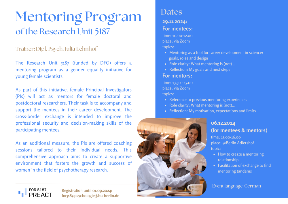 On 29.11.2024 and 06.12.2024, the 2-part program on "Mentoring" organised by FOR 5187 will take place. The program is aimed at internal female early career researchers. Female Principal Investigators (PIs) act as mentors for female doctoral and postdoctoral researchers. Their task is to accompany and support the mentees in their career development. As an additional measure, the PIs receive coaching sessions tailored to their individual needs. This comprehensive approach aims to create a supportive environment that fosters the growth and success of women in the field of psychotherapy research.